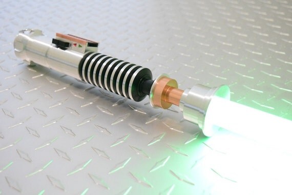 This saber features an accurate .65 thin neck. Our revolutionary thin neck blade socket, is durable enough for the strongest full contact dueling, without sacrificing asthetics. The elegant handle features an activation box with copper accents, red/green arrows, and a black greeblie. A tri ring is included on all standard builds, a D ring is included on all weathered builds.