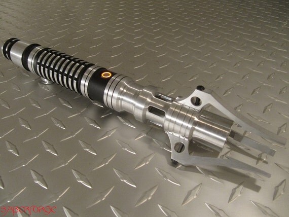 The elegant handle features a recessed light up AV switch, and a comfortable low profile recharge port. Accent windows allow the blades light to shine through, and a blade plug is included for display. An aluminum covertech disk and three menacing claws complete the hilts aesthetic.