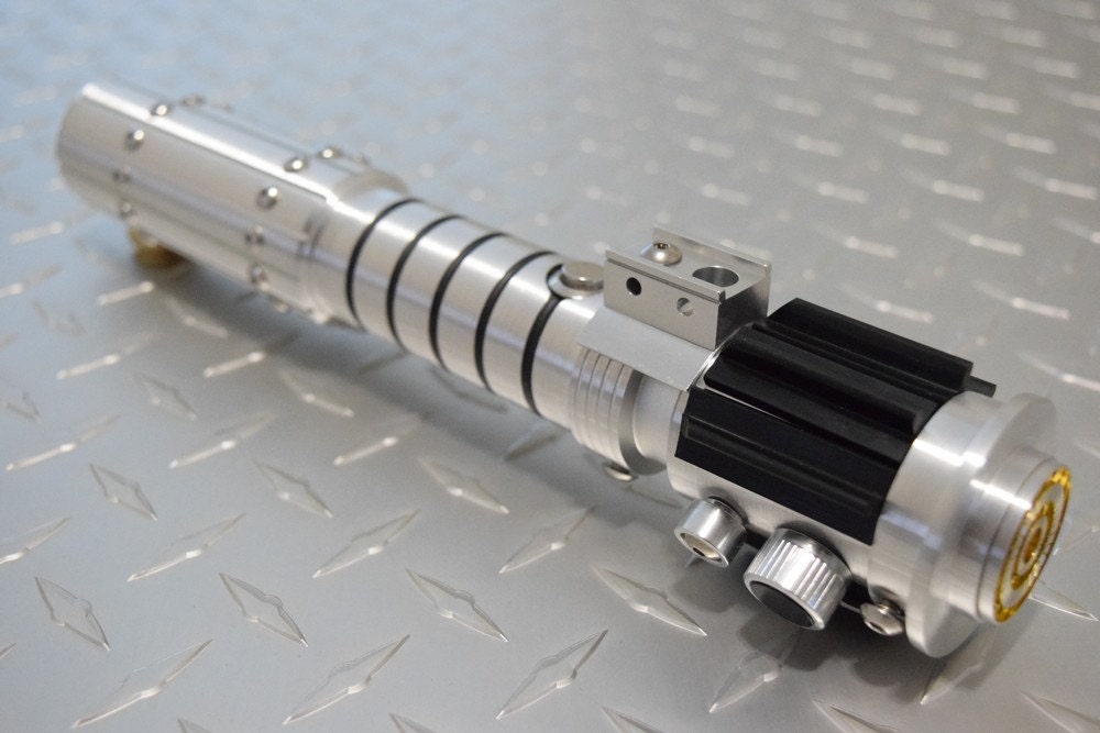 The hilt is machined by a professional blade smith, with tireless care given to every detail of it's construction. The focal point of the hilt is a segmented grip section, and media blasted control box, with black graflex t grips arrayed around the emitter.
