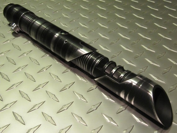The Epoch is an ultra bright LED Saber in my Battle Saber series. The design of the saber body is aggressive and menacing. Windows are machined into the center of the emitter and provide a view of the energy blade. The metal anti vandal switch is recessed into the handle, and protected, so it can not be accidentally shut off while dueling.